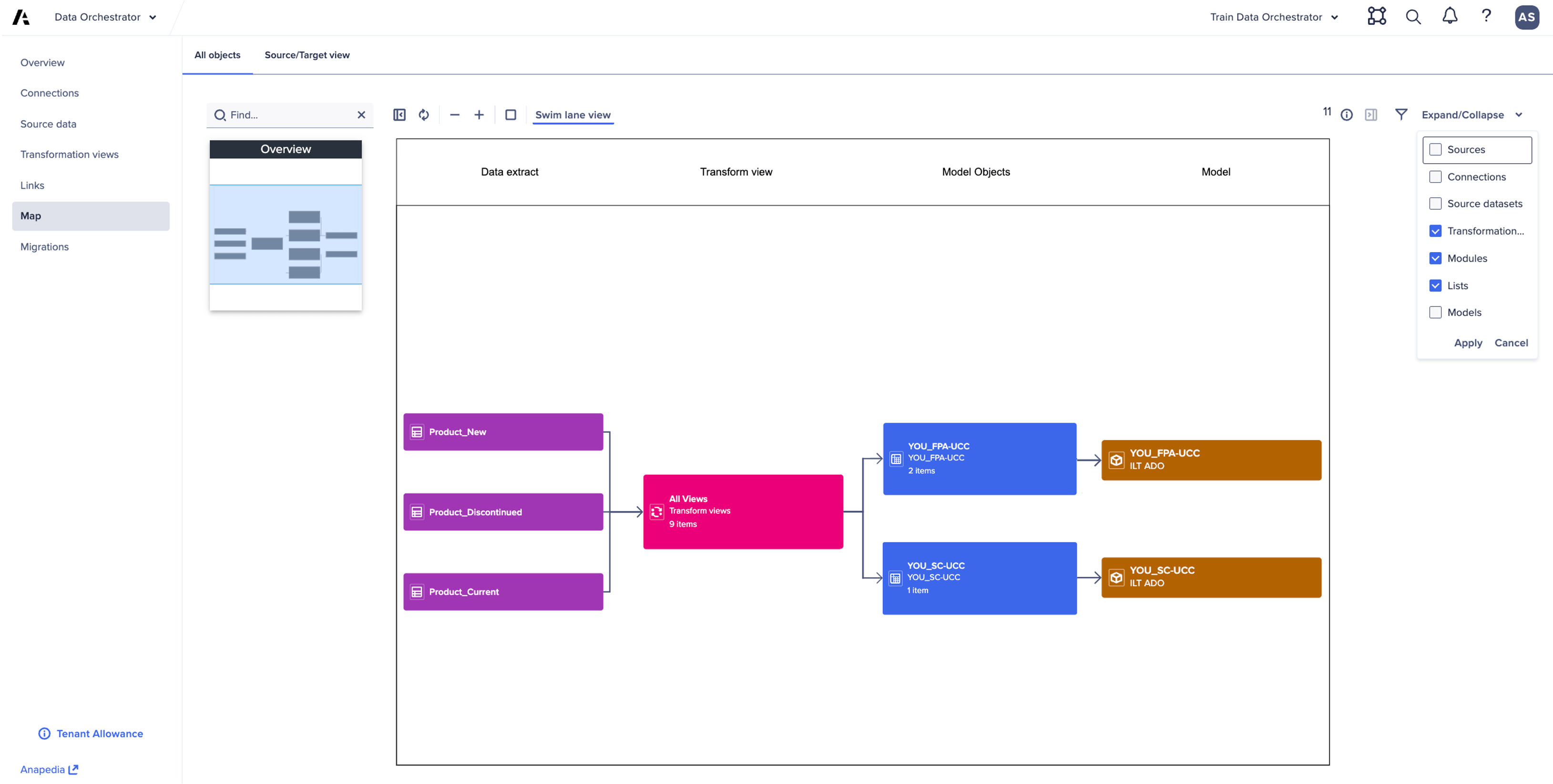 - Data lineage map: On the Map page, the display of objects can be organized into swim lanes, providing a more organized display when many objects are shown. Additionally, groups of objects can be collapsed and expanded, allowing the map to be focused on types of flows at different levels. A source/target view is also available as a tab, which auto filters datasets (both source datasets and those derived using transformation views) to provide a view focused on data sources and which models they target.