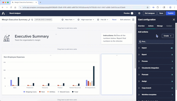 Page builders can configure navigation action buttons to link to external URLs, including non-Anaplan URLs, which will open in a new browser tab. This feature can be used to drive a more connected and streamlined experience by linking to other apps, providing shortcuts to platform pages such as their Workflow task inbox, and linking to external documentation, training, or job aids.