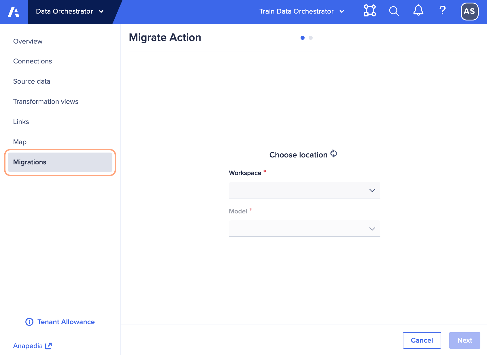 - Migrations menu item: The import Actions tab can now be found under the Migrations menu item for faster access and to clarify this as a basic migration capability when moving to Data Orchestrator from a classic Data Hub approach. This tab was previously on the Links page.