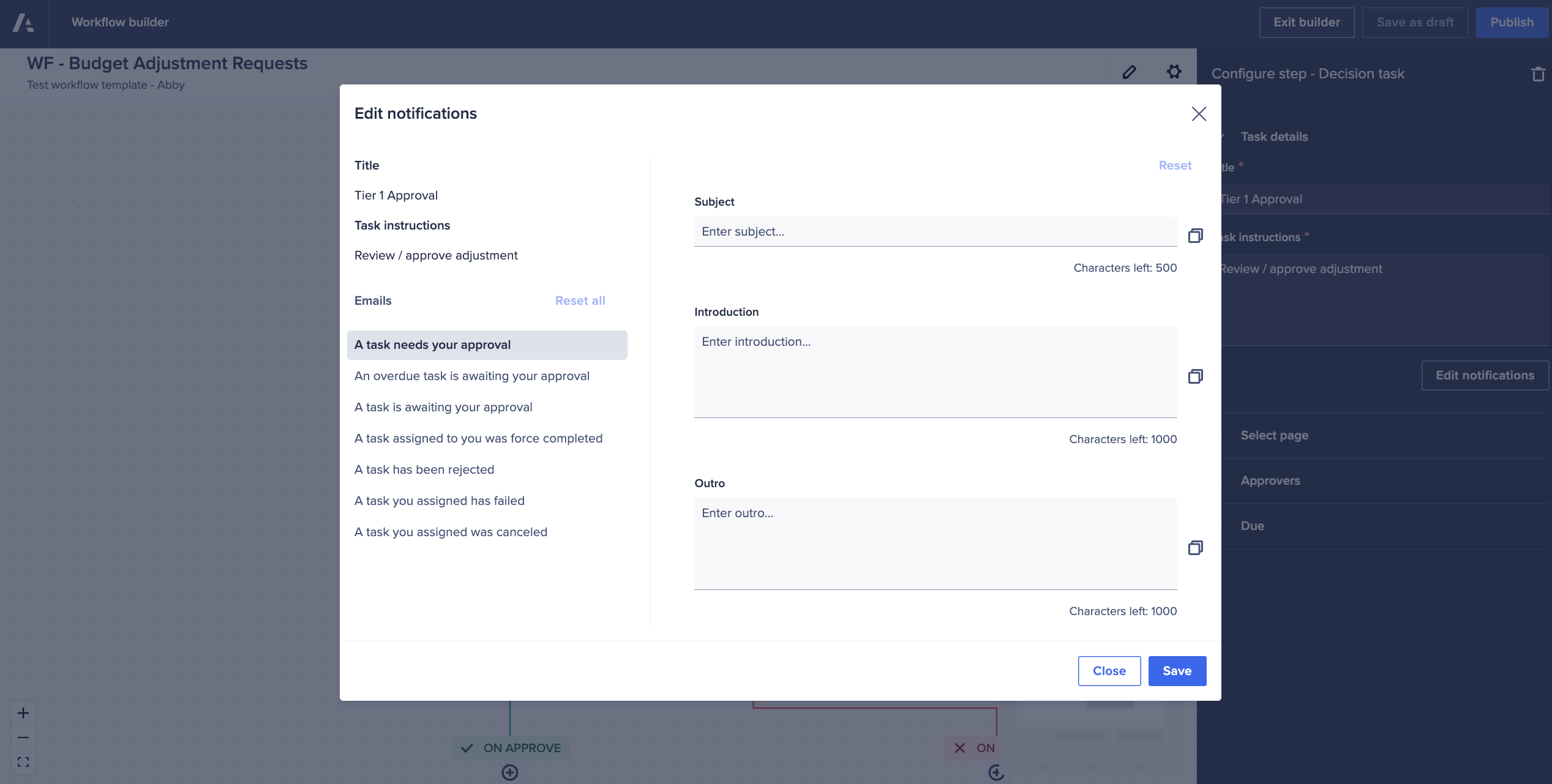 - Custom email contents: Workflow Owners can now write their own notification emails, including custom subject lines, intro text, and outro text. This enhances the experience by providing a more tailored and intuitive message that resonates more closely and drives more effective calls-to-action.