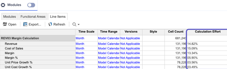 Calculation Effort is now available in Classic, either in Blueprint view or the Line Items section of the Module Panel. The column displays the percentage of computational effort required for each line item. Opening a model initiates the calculation of all its line items, which means opening time varies based on model complexity and data volume. Once the model is opened, the Calculation Effort column will show which line items in the model require the most computation and may require optimization. For more, check out this community article here.