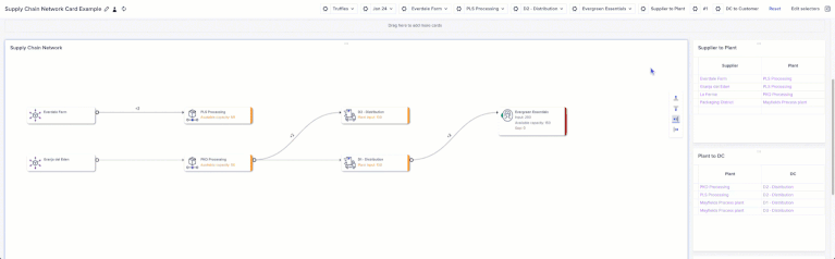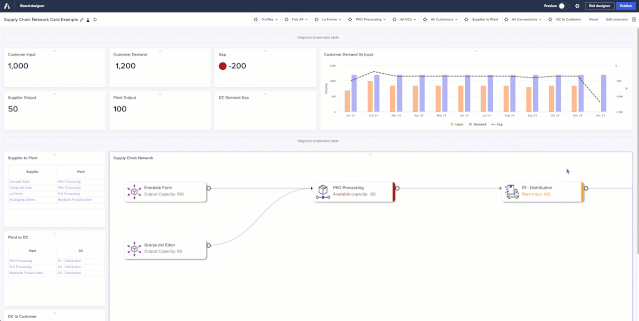 - Network Charts: This new card type enables customers to visualize their supply chain network in the UX, including visualizing the relationship from Suppliers to Plants to Distribution Centers to Customers and identifying bottlenecks. Use conditional formatting to highlight line items or production issues based on business logic, update the model and see the impact in real time, or model multiple scenarios and see the impact over time. More information available in the official Network Charts release notes.