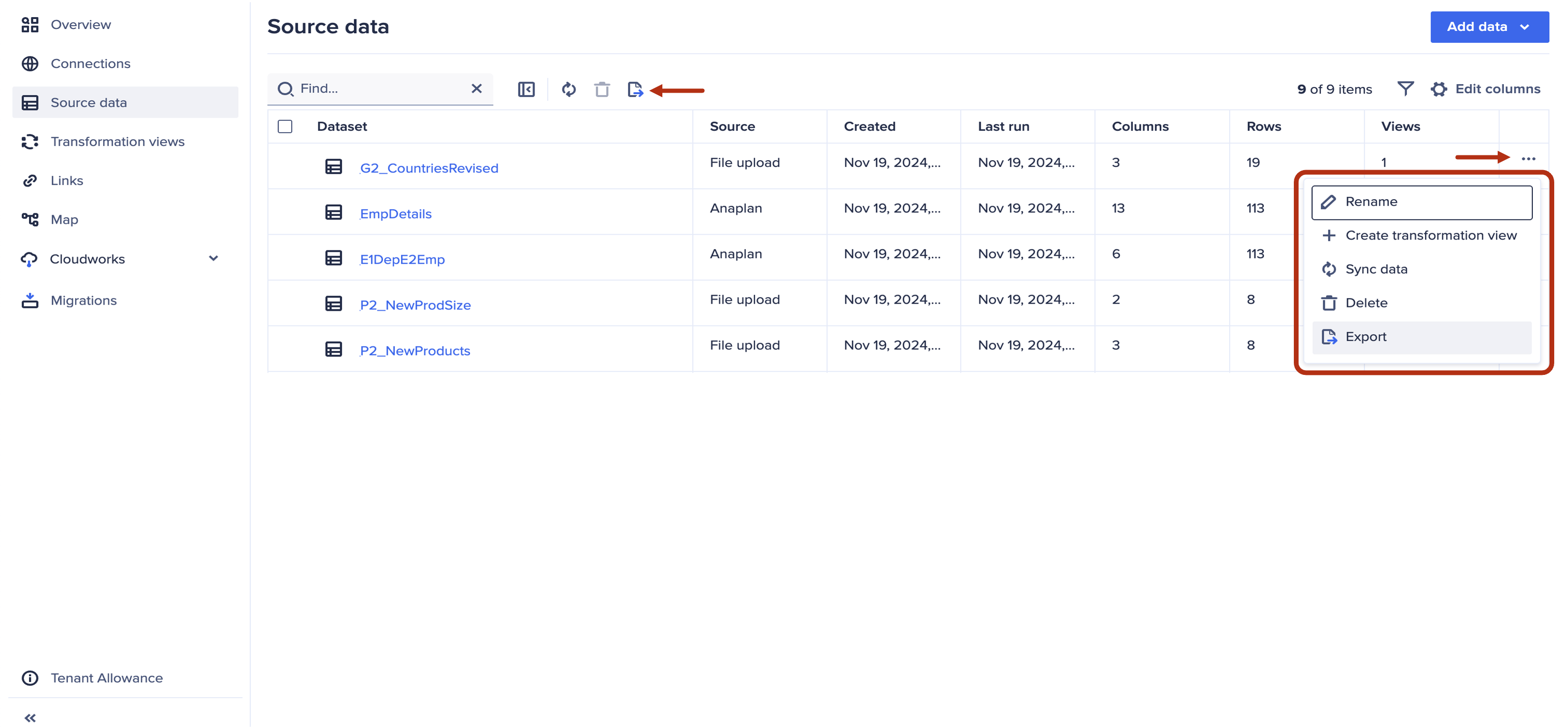 Inventory pages for connections, source data, and links can now be exported to CSV, along with datasets (both source datasets and those derived from transformation views). The files are exported in 500MB segments. Download is currently limited to only the first segment, which would typically be more than 1 million rows.