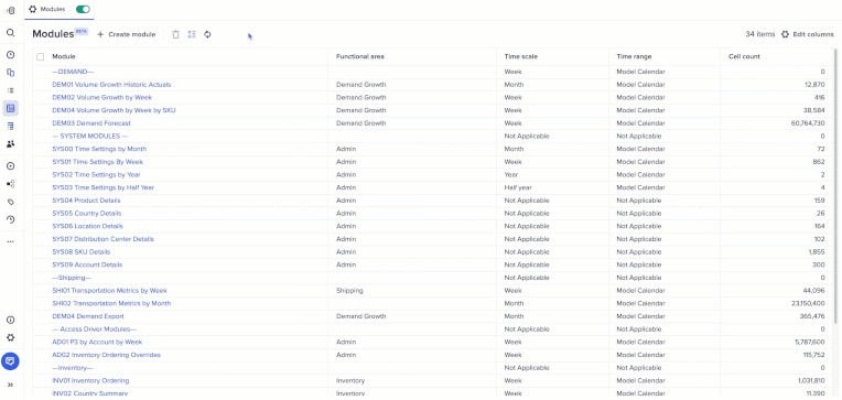 In the New Modules Inventory, columns containing dependency data are now clickable, offering model builders quick, seamless access to linked objects for a more efficient modeling experience. Model builders can access the New Modules Inventory via a toggle on the current modules inventory page.