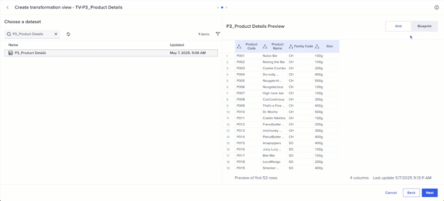 - Preview dataset when mapping to model or selecting for transformation view: When selecting a dataset to map to a model link or as the source of a transformation view, there is now the option to see a preview of the data in grid view or a definition of the dataset in blueprint view. This feature improves accuracy and efficiency during dataset selection-leading to more reliable models and smoother data transformations.