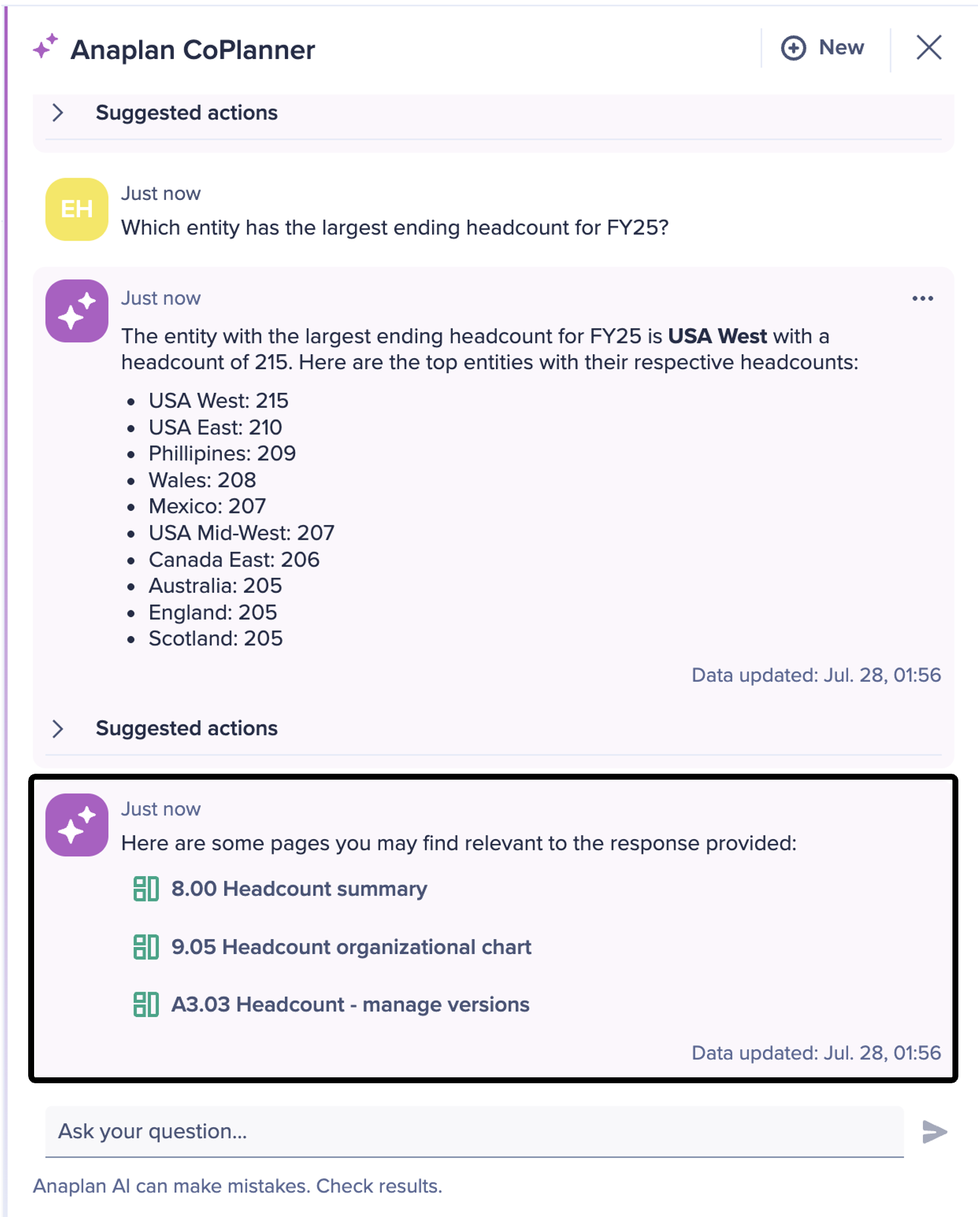 CoPlanner can now display up to three direct links to relevant pages in response to a user's question. These links are contextual, personalized based on access permissions. They're designed to help users explore insights, locate where key actions can be taken, and quickly access related content.