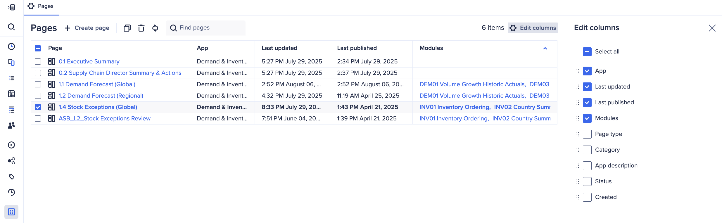 The Pages Inventory has been enhanced to provide a more seamless and unified experience, aligning closely with the functionality of the New Modules Inventory. This includes a compact toolbar, page deletion, editable table columns, enhanced column sorting and arrangement, modules attribute column, and persistent right-hand panel tabs.
