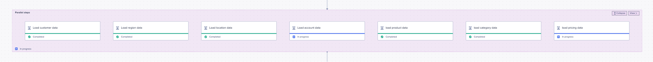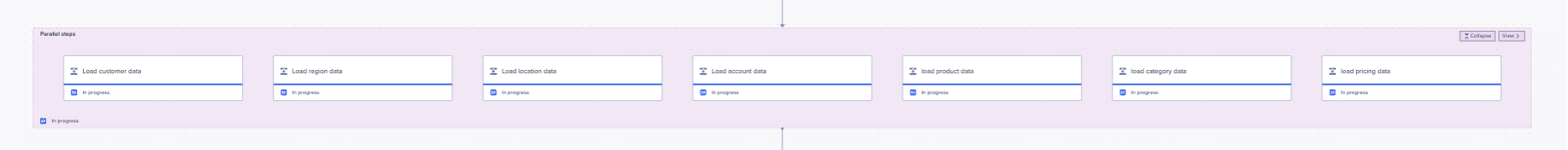 When you run the workflow now you will see all the steps begin processing at the same time: You may see five complete first as ADO only allows for five concurrent syncs: This will have shortened the time it takes to load (sync) data into ADO, compared to a sequential workflow with the same extract actions.
