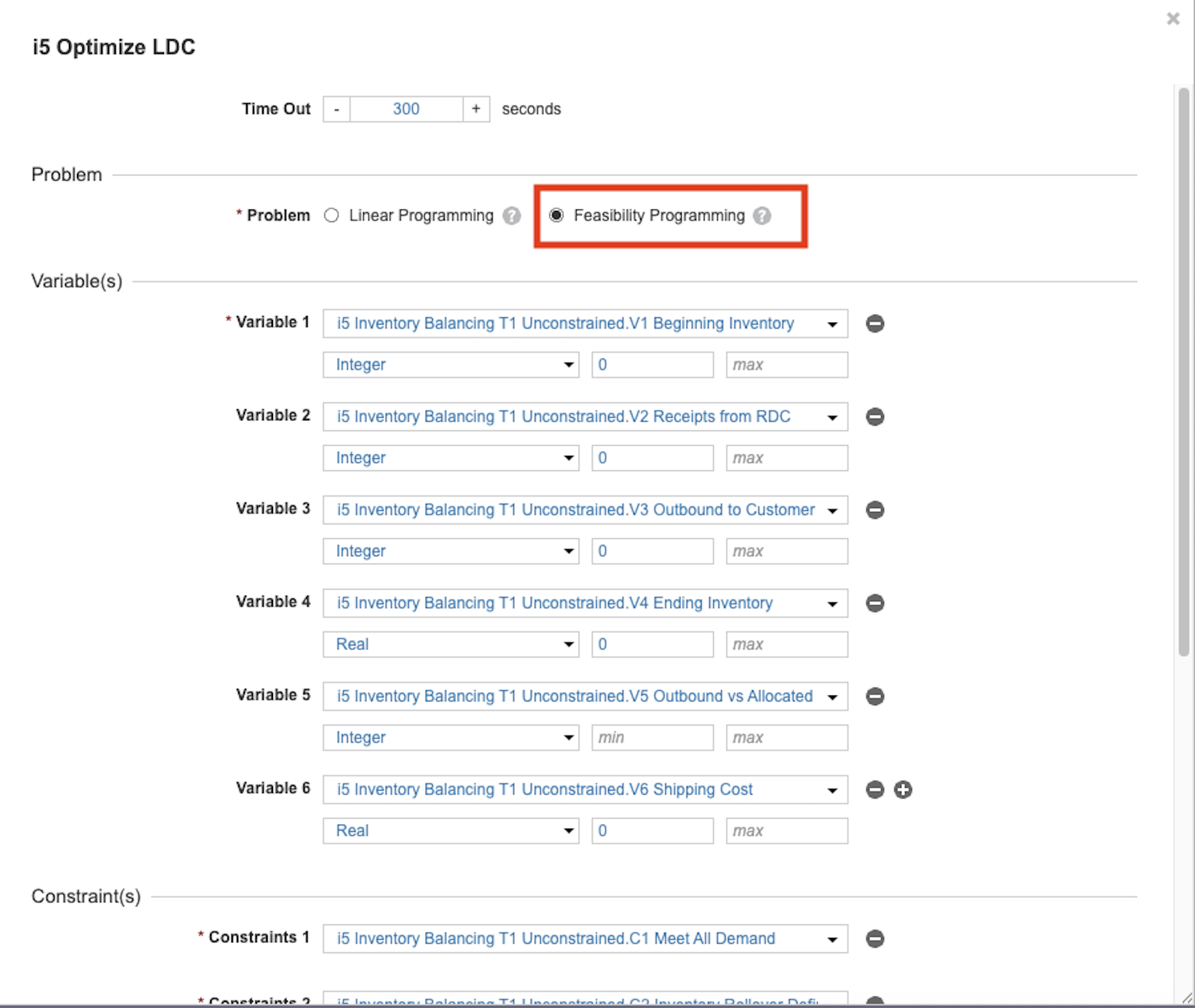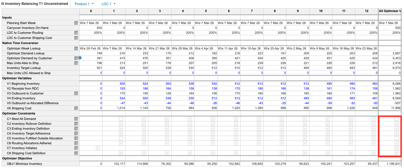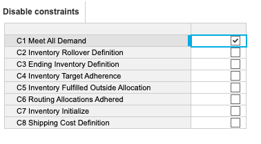 - Update your constraint formulas to: <disable constraint> OR <constraint>. For example: DisableConstraints.'C1 Meet All Demand' OR ('V3 Outbound to Customer' = Optimizer Demand by Customer). In this formula, if the disabled constraint switch is True, the overall statement is always satisfied, making the constraint inactive.
