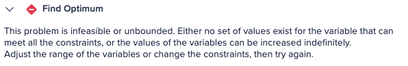 Explanation: Since all constraints must be True, if the boolean is True, the constraint is automatically satisfied, so the Optimizer ignores the equation. The Optimizer only checks the actual constraint if the boolean is False. This empowering method makes it easy to isolate which constraint is causing infeasibility, giving you control over your modeling process. - Now you can disable the suspect constraint and run the optimization to check if the model has any feasible solution.