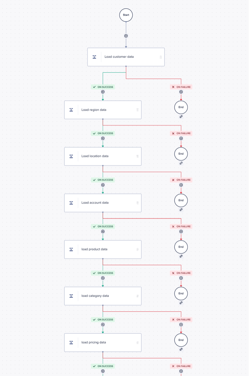 The first thing to know, when you setup a workflow to do ADO extracts it defaults to “Branch the workflow” on step failure. This creates a sequential process for running ADO tasks. This can be a good solution when you have dependent steps you want run in a specific order. The default workflow will end up with a template that looks like this: