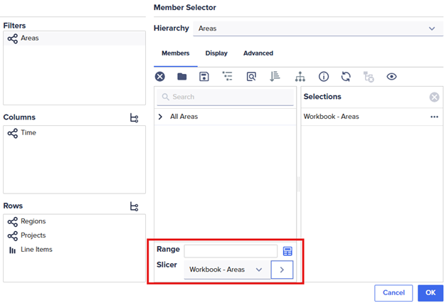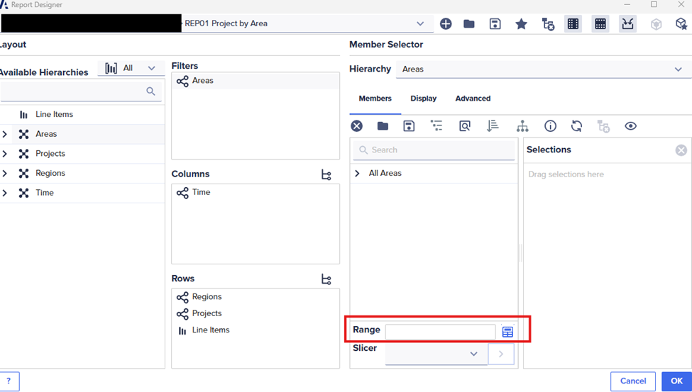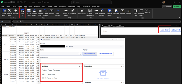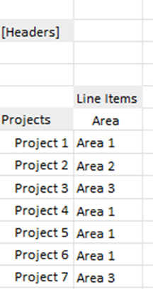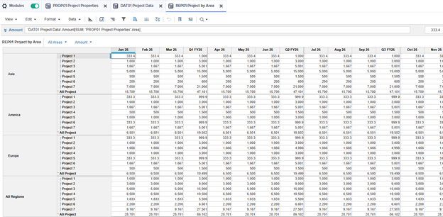 I have 2 modules, the first one contains the numerical data on projects and region dimensions. The second one has the project property, which is the area each project is applied to. In the module view, I can nest the region, project, and filter to only projects that are in a specific area based on their property.