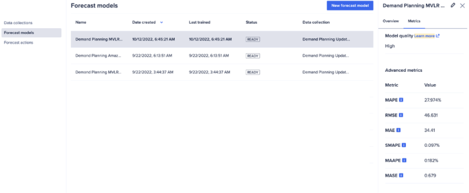 Forecaster automatically generates some forecast accuracy metrics as soon as you build a forecast model. The automated metrics are there to help quickly check overall accuracy, especially when building multiple forecast models in succession with the same data set. These metrics include RMSE, MAPE, MAE, MAAPE, sMAPe, and MASE, and an overall model quality metric, which are described in more detail in Anapedia Understand Advanced Metrics.