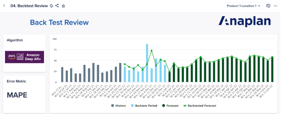 Instead of relying on the automatically-generated backtest results, you may also create your own backtest window and calculate forecast accuracy metrics yourself in Anaplan. There are several reasons to do this. First, you may want to customize the length of the backtest window to be shorter or longer than the automatically-generated results. However, keep in mind we recommend using a backtest window that is the same length as the forecast horizon as a baseline. That way you can evaluate performance across the entire forecast window. Especially if there are major seasonal or cyclical trends that impact business, you should try to capture the full cycle in the backtest window.