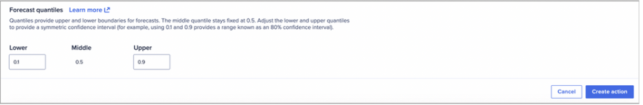 Forecaster supports 3 forecast quantiles generated with a single forecast action. The middle quantile stays fixed at P50. The lower and upper quantiles can be configured by the user. By default, Forecaster sets the lower and upper quantiles to P10 and P90.