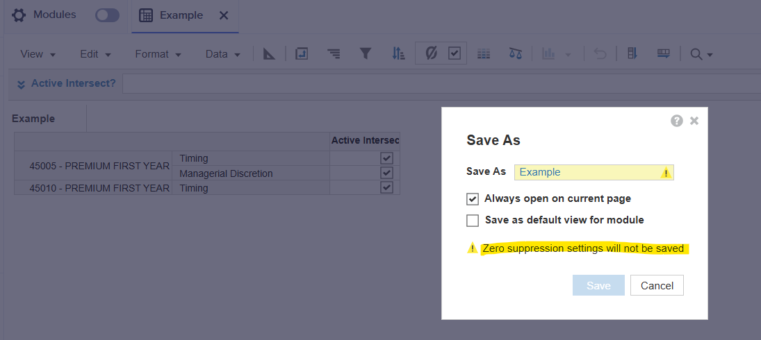 Within Polaris there is the ability to suppress cells with zeros values within the module or grid of the UX but currently there is a limitation where these setting cannot be saved. This necessitates usage of filters to limit the number of cells within saved views whereas the ability to save this suppression would natively address many use cases.