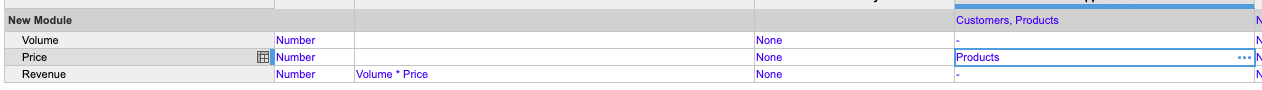 Let's assume I have a module with Customers & Products dimension and line items Volume (Input), Price (Input) and Revenue (Volume x Price). The volume and revenue are dependent of both dimensions but the price doesn't differ between customers. Therefore, the price line item is a subsidiary view with only products: