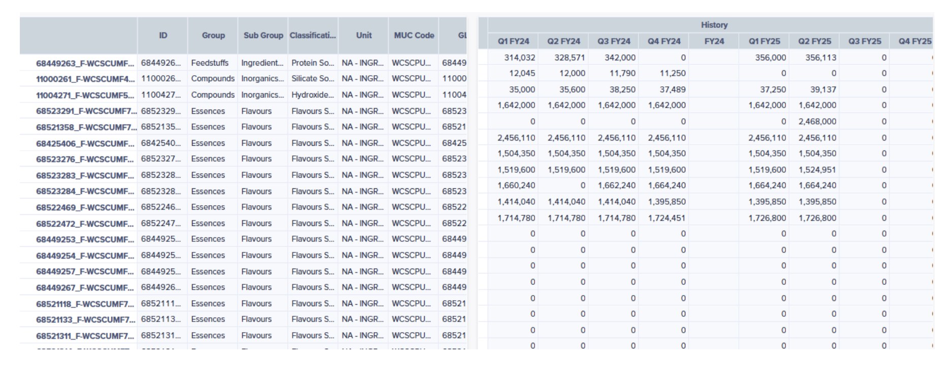 Unilever has a large-scale forecasting process with over 800 users globally. Their challenge was to display all material attributes (like Group, Subgroup, Classification) and reference numbers alongside the forecast data in a single view.