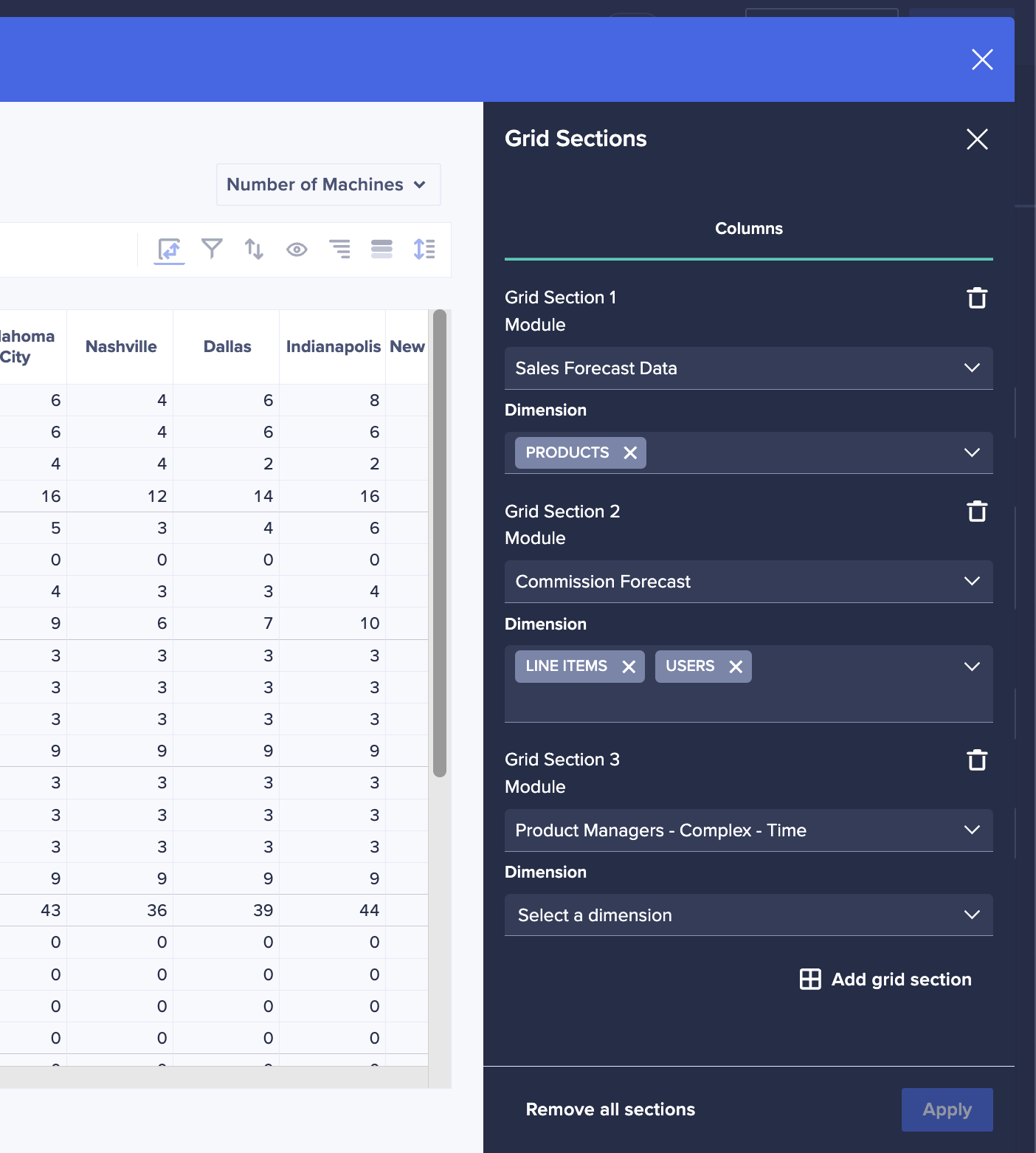 - Combine Grids: In "View designer" mode, click on the ‘Add Grid Sections’ button located above the main grid. A right-hand panel will appear allowing you to select up to four additional modules to combine to your primary module. Remember, for grids to be combined, they must have a common row axis so, all dimensions in rows must be present in the additional modules you wish to add.