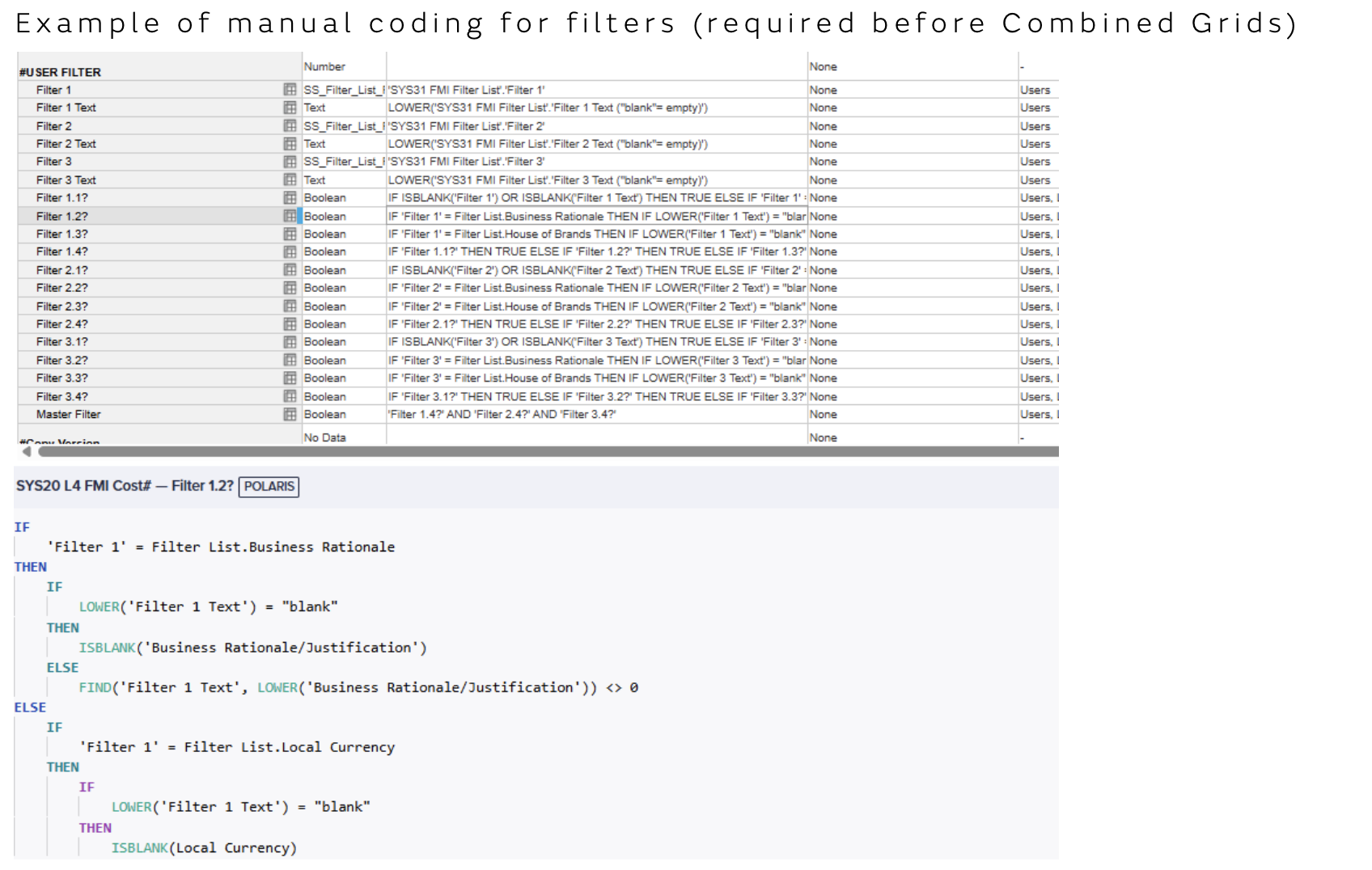 Before: This required two separate modules — one for the attributes and one for the budget values. On the UX page, users had to input data on two separate grids and perform two separate exports to get a complete picture. Filtering was complex and had to be pre-coded by their model builders.