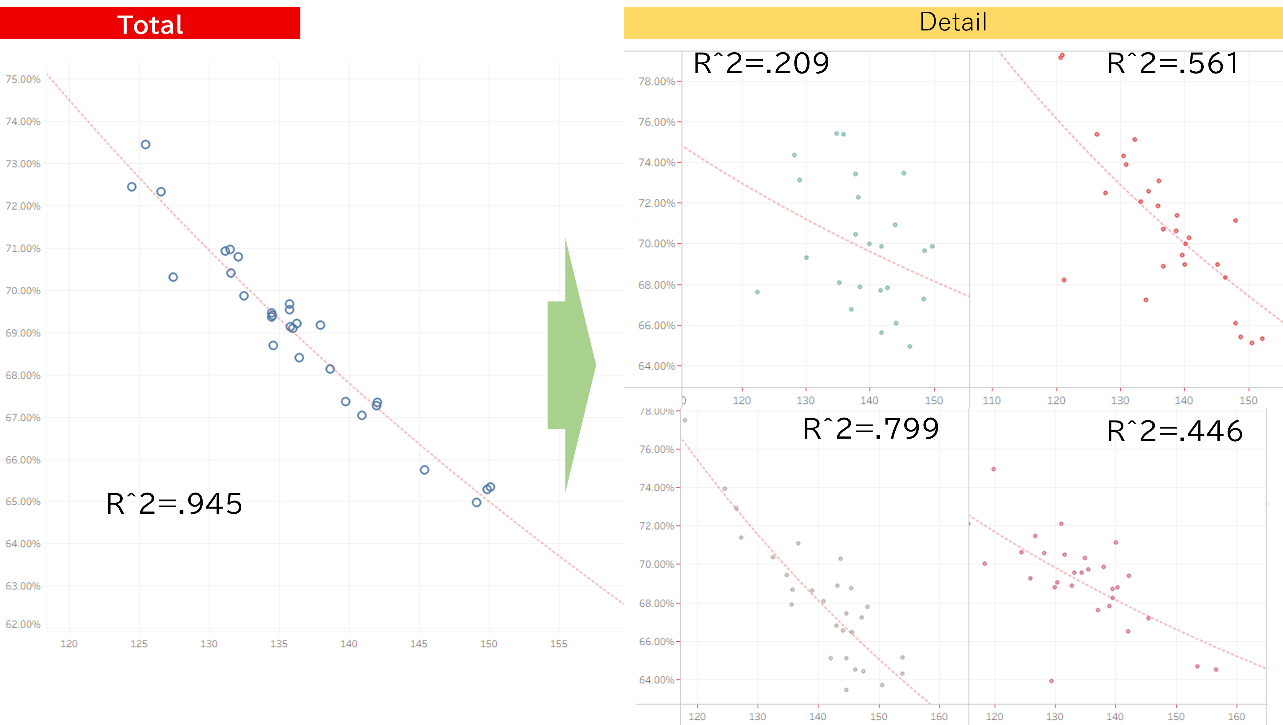 Figure 1 demonstrates this pattern using real data from our organization: at the Total level, outcomes consistently align with statistical models (R²=0.945). At the Detail level, predictability varies widely — some units maintain reasonable correlation (R²~0.80), but many show weak or unreliable patterns (R²=0.21-0.45).
