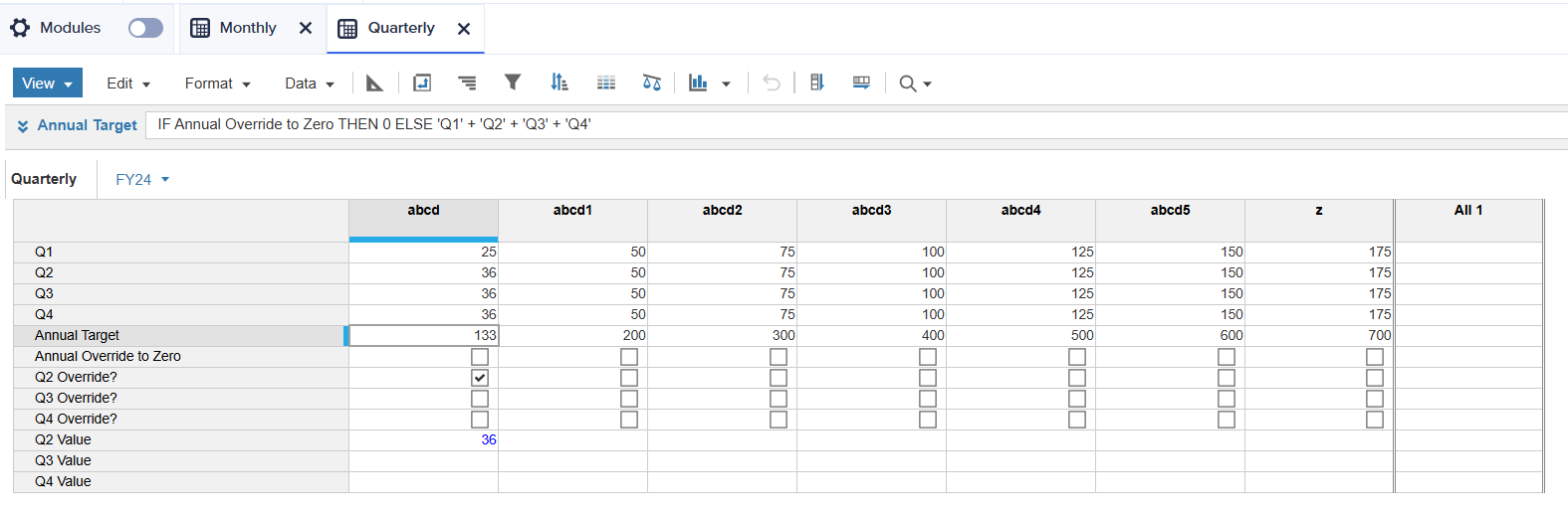 Annual=$0, all quarters and all months become 0. Q2 override entered then Q2, Q3, Q4 months reflect override value/3months. If no overrides, monthly values = (Annual/4 Quarters)/3months