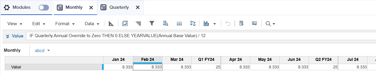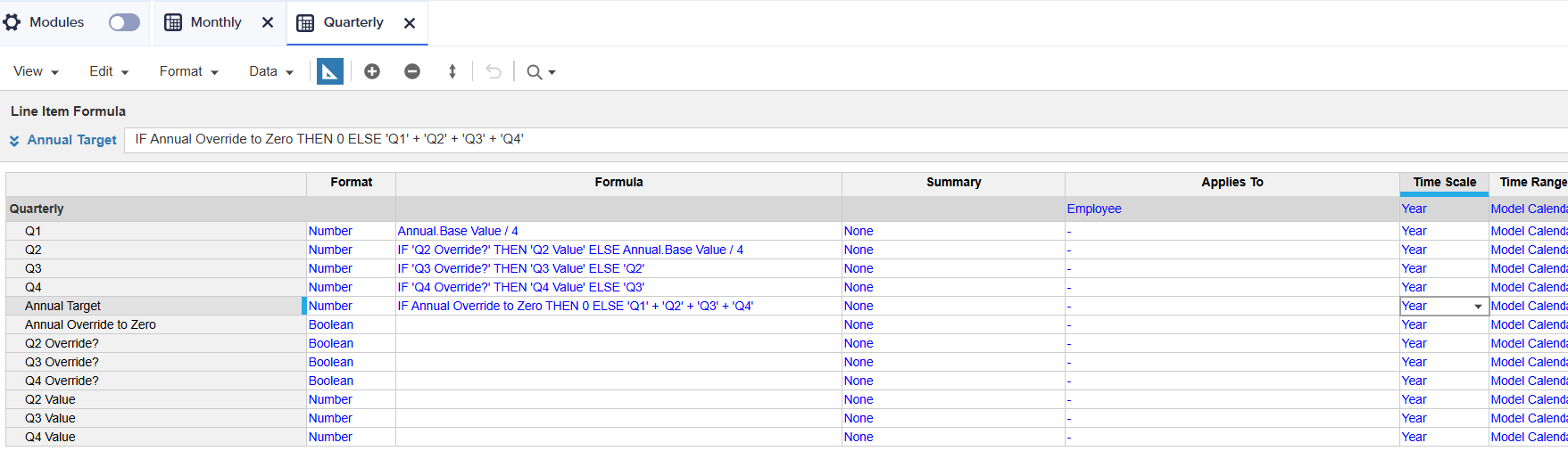 I have 3 modules. First module has list with yearly values. second module has line items that convert the yearly data to quarterly. I want to convert quarterly data monthly in third module. The quarterly module has override capabilities so if user select set annual to 0, then the total for that year will be 0. If user select override for Q2, then the updated value of Q2 will be carried down to Q3 & Q4. First module is year timescale, second is also year timescale and third module is month timescale.