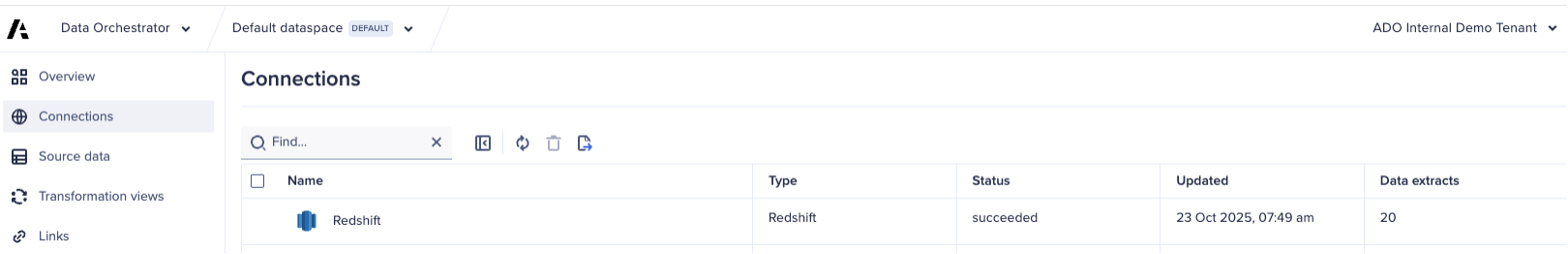 The Redshift connector enables direct extraction of data from your Amazon Redshift data warehouse into Anaplan's Data Orchestration (ADO) layer. This means your carefully curated, transformed data in Redshift flows seamlessly into ADO, where it can then be easily pushed to your planning models using links. The connection flow is clearly visualized in your data map, giving you complete transparency into how data moves from source through ADO to your models, enabling better governance and troubleshooting.