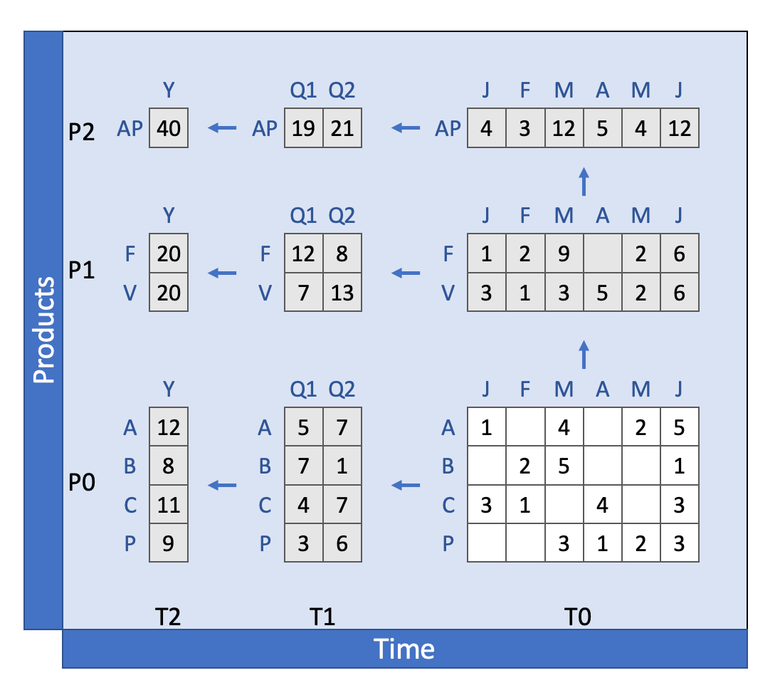 Consider a line item dimensioned by both Products and Time, where the Products dimension has a deep hierarchy (e.g., multiple levels of product categories) and the Time dimension spans several years with detailed monthly data. Without On-Demand calculation, all aggregates will be calculated at model-open time and on recalculation as below: