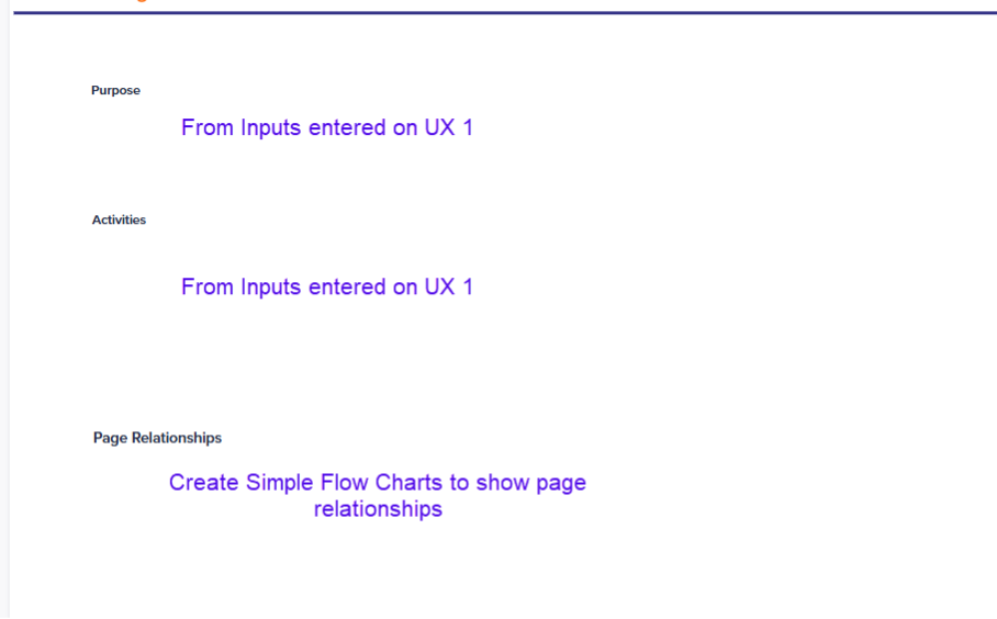 UX 1: Page details: More of an end user page to input details to include in the output Page. Include links to model flows, Page links, Text for Purpose and activities, etc.
