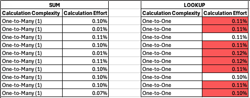 For both methods of pulling data from DAT (SUM and LOOKUP), I applied the formula and then restarted the model to analyze the Calculation Effort %. To my surprise, the Calculation Effort is higher when using LOOKUP than when using SUM.