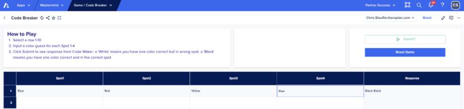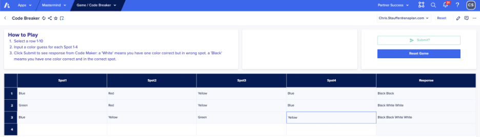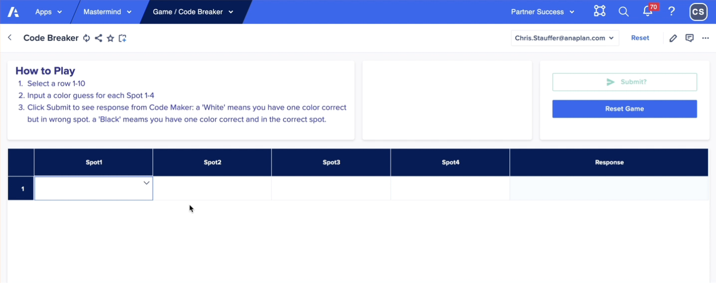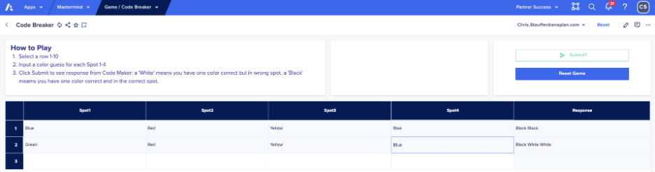 You have to be a little lucky to break the code on the fourth guess, but hopefully by now you get the idea of how the game works in Anaplan.