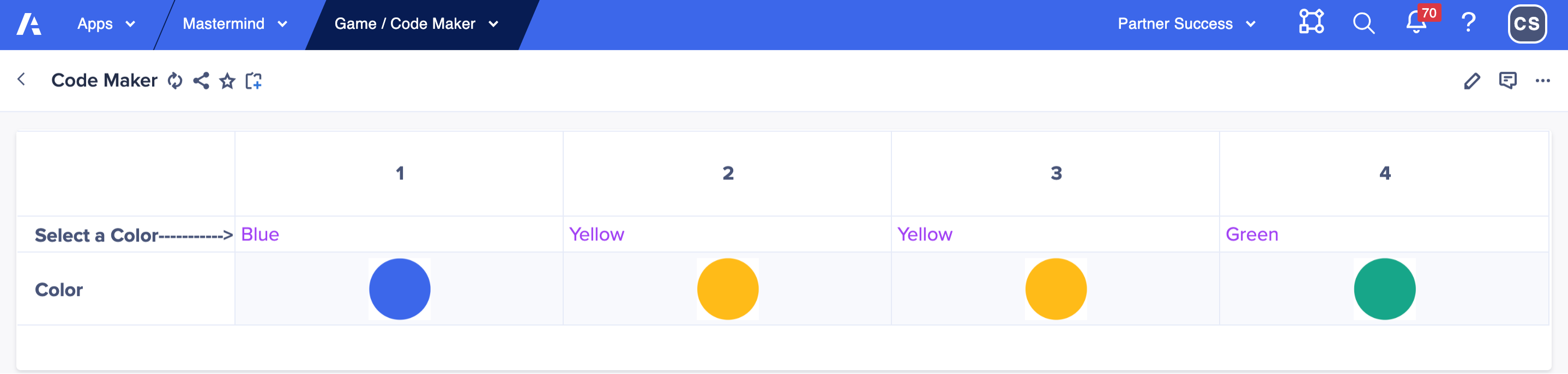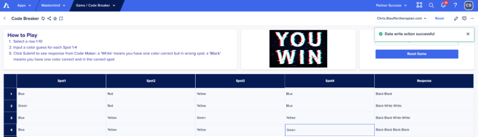 The code breaker simply clicks the first row in the grid, uses a list drop down to make color guesses and then clicks the Submit? button. A data write action writes a true boolean into the code breaker module to turn on the module logic checking, turns on DCA to lock the row submission, and provides an automatic calculated code maker response. Unlike the real board game, the code maker does not have to think about the response nor drop those tiny black and white pins into the tiny holes in the board — the calc module does the work automatically and correctly every time! I’ve been guilty of not providing the correct response to a code breaker attempt which can upset the game and the code breaker.