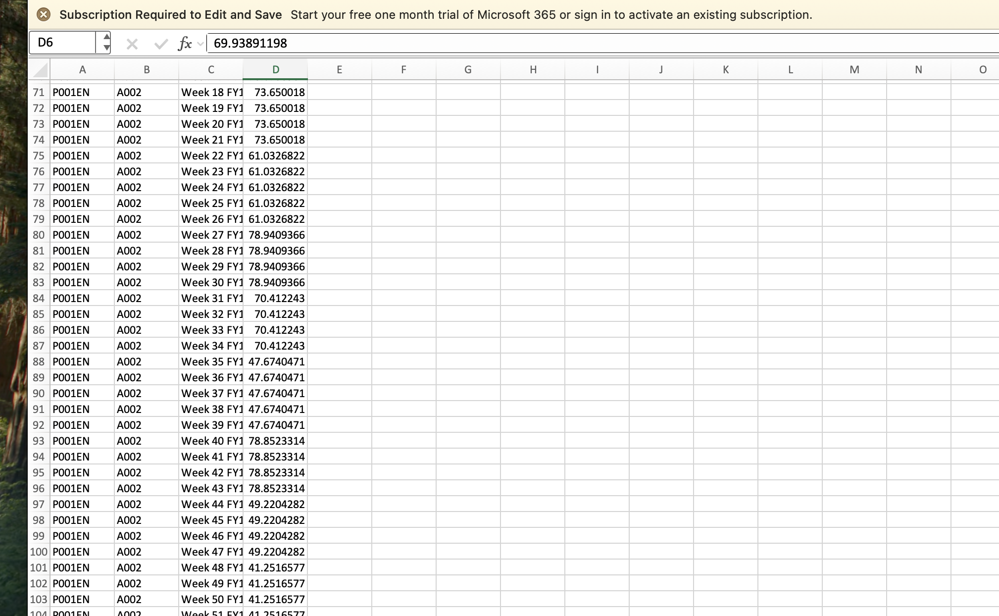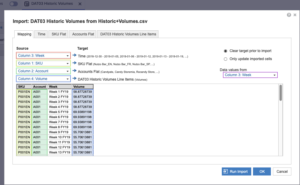 I am trying to import data using the export file of the module which has weekly time scale. Every other dimension mapping is ok instead of the time mapping as the exported file has week as time dimension but the target has format of ddmmyyyy to ddmmyyyy.