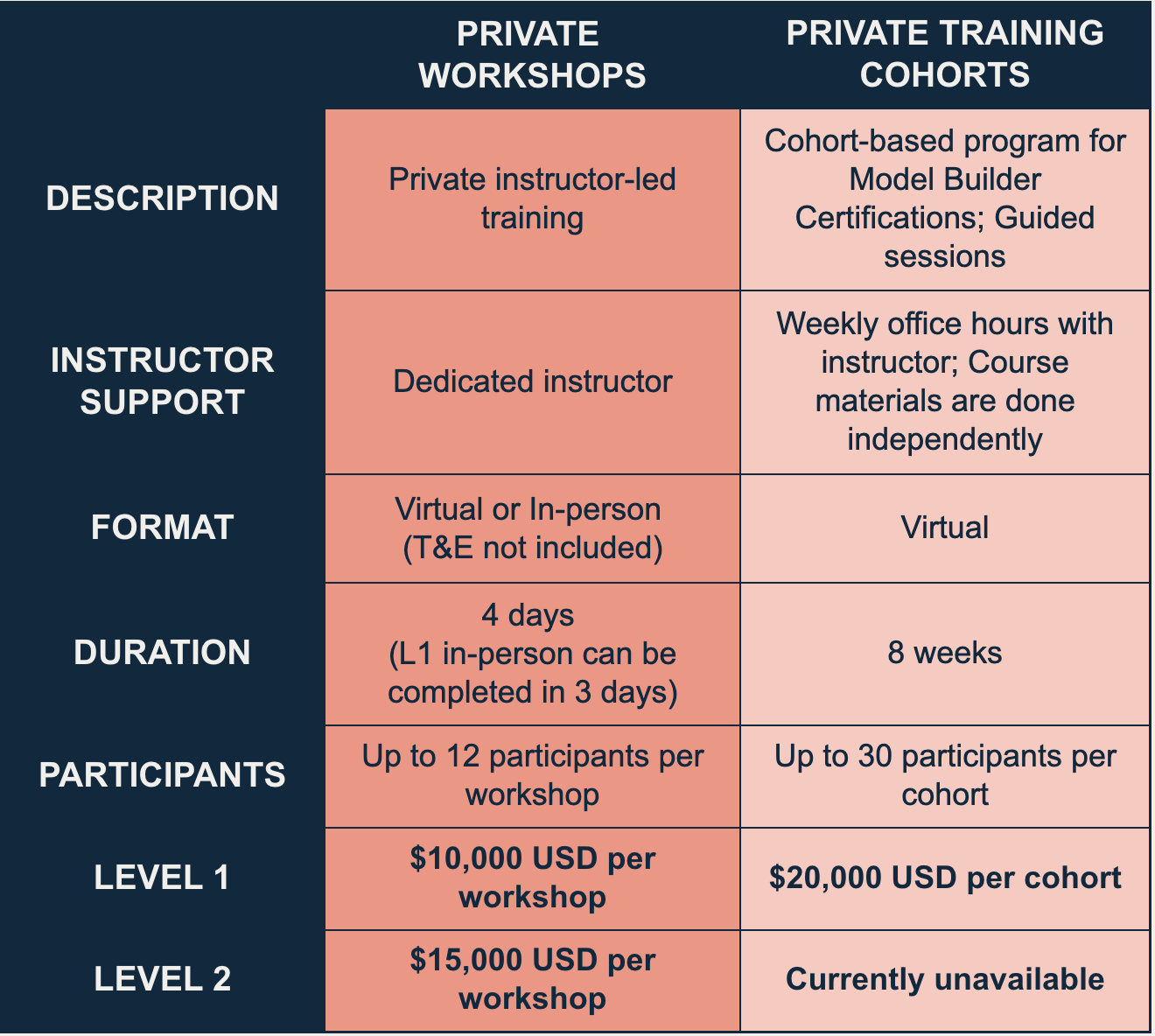 - Private Cohorts are scheduled differently and require 1-2 instructor hours a week for all 8 weeks. Dates and times are flexible.