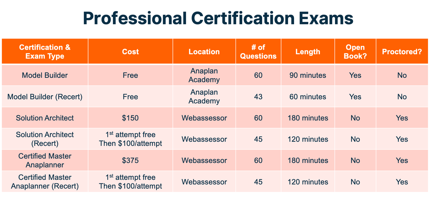 1. Professional Model Builder Total Estimated Time to Complete: Approximately 74 hours Training Requirements: Level 1 Model Building (25 hours) Level 2 Model Building (35 hours)The Anaplan Way (10 hours) Certification Requirements: Professional Model Builder ExamOpen-Book, $0Apx. 3 hours (includes study time) 2. Professional Solution Architect Prerequisite: Professional Model Builder Total Estimated Time to Complete: Approximately 60 hours (additional to Model Builder) Training Requirements: Anaplan Model Building Level 3 (50 hours)Certification Requirements: Experience & Design Review + Certification: Review of at least 2 projects Reference checksReview of Level 3 model Professional Solution Architect Exam:$150 for 2 attempts Approx. 10 hours (includes study time) 3. Certified Master Anaplanner Prerequisite: Professional Model Builder Professional Solution Architect Total Estimated Time to Complete: Approximately 10 hours (additional to Solution Architect) Training Requirements:NoneCertification Requirements: Certified Master Anaplanner Exam: $375 for 2 attemptsApprox. 5 hours Important Notes: Exam Fees: All listed exam fees are subject to local tax. Time Estimates: All times are approximate and include self-study. They serve as a general guide and may vary based on individual learning pace and prior experience. Overview of Professional Certification Exams